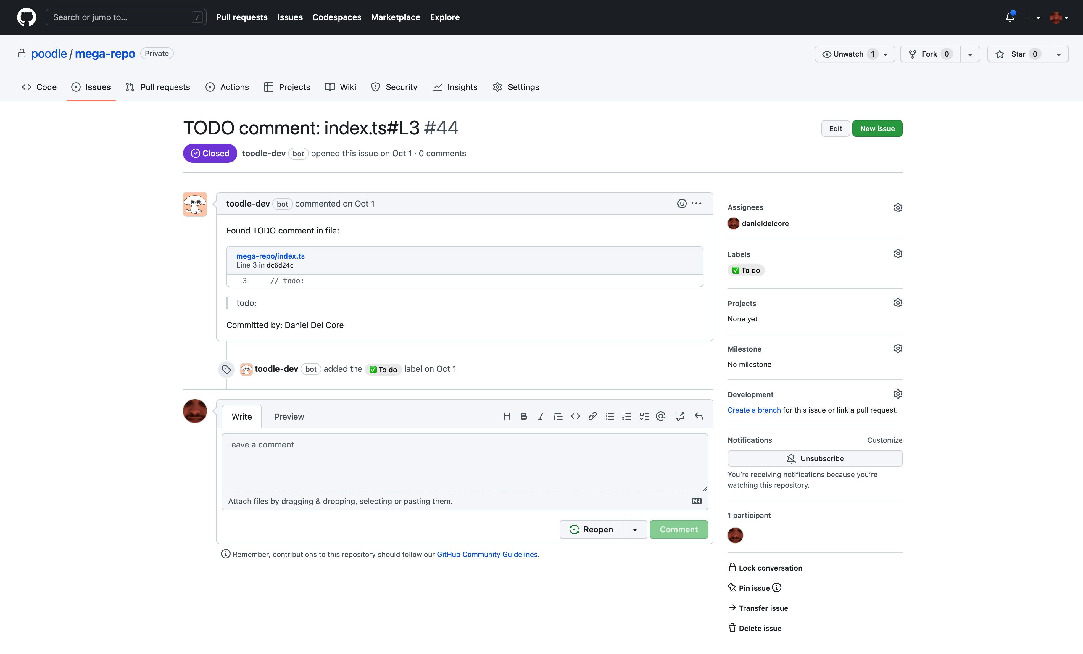 Toodle automatically captures // todo comments in code and converts them into GitHub issues.
